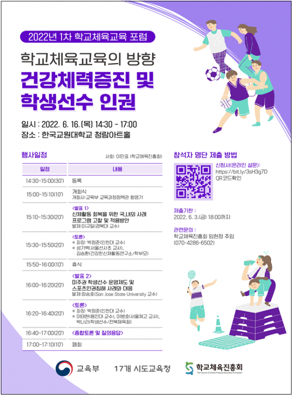 발제 이후 지정토론과 종합토론에서는 체육 분야의 전문가, 현장 교원, 학생선수와 학부모 등이 참석해 현장의 의견을 제시하고 공유하며 지속 발전 가능한 학교체육교육의 모습에 대해 논의하는 시간을 갖는다.