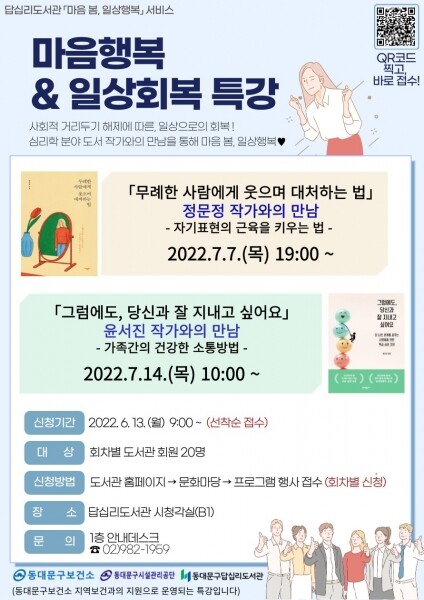 ‘마음 행복&일상 회복 특강’은 ‘마음 봄, 일상 행복 서비스’의 일환으로 진행되는 프로그램으로 동대문구보건소 지역보건과의 지원을 받아 주민들의 마음건강을 살피기 위해 선정한 심리학 분야 도서 작가들과의 만남을 두 차례 진행한다.