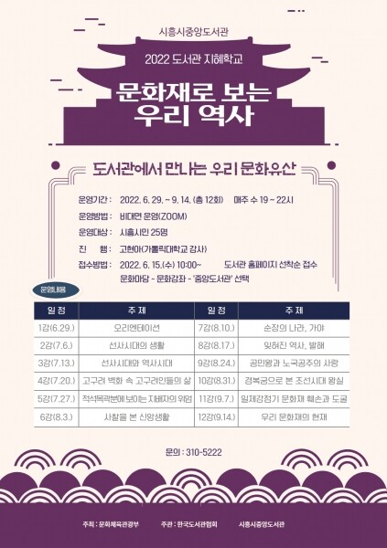 6월 29일부터 9월 14일까지 매주 수요일 저녁 7시에 온라인 화상회의 플랫폼 줌을 통해 열리며 참여를 원하는 시민은 시흥시도서관 홈페이지를 통해 접수하면 된다.