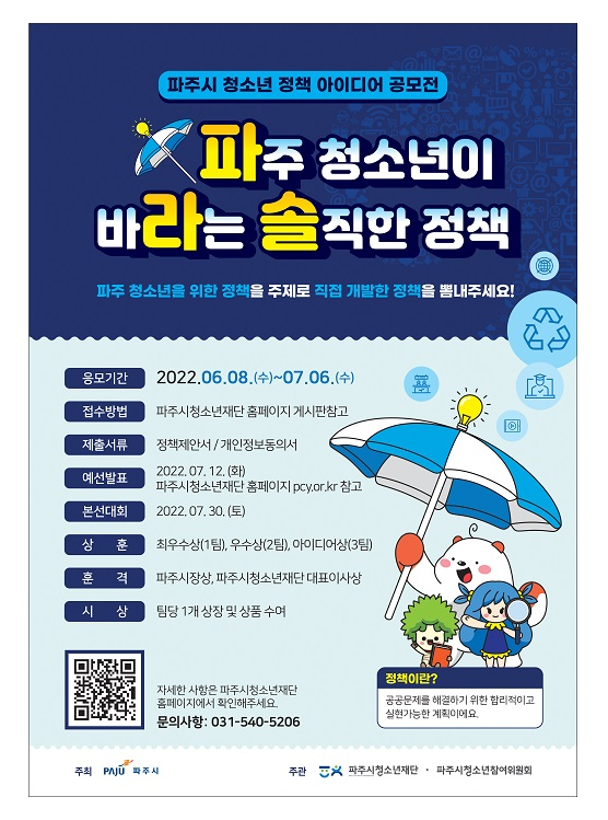 이번 공모전은 파주시 관내 거주 또는 재학 중인 만 9세~24세 청소년이라면 개인 또는 5인 이내의 팀으로 누구나 참여할 수 있으며 예선심사 및 본선대회를 거쳐 최우수상 우수상 아이디어상을 선발할 예정이다.