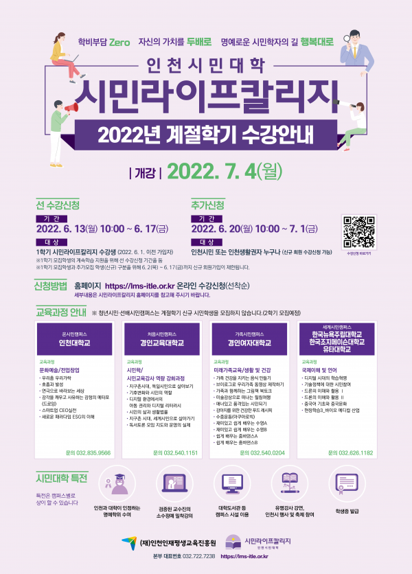 인천시민대학 시민라이프 칼리지 계절학기와 관련된 세부내용은 홈페이지를 통해서 확인할 수 있다.