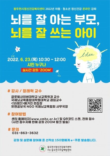 이에 동두천시정신건강복지센터는 글로벌사이버대학교 뇌교육학과 장래혁 교수를 초빙해 코로나19가 아이들의 뇌성장과 발달에 미치는 영향’, ‘아이큐 부모 vs 다중지능 아이’, 인간 뇌의 특별함, 인공지능 시대의 인간 고유역량 계발 등 학부모들이 꼭 알아야 할 아동·청소년기의 정신건강에 대한 올바른 이해와 대처 방법에 대해 강좌를 진행한다.