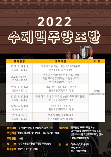 교육기간은 오는 29일부터 8월 3일까지 매주 수요일 총 6회에 걸쳐 진행하며 교육대상은 2020년 수제맥주양조반 교육 참여자를 제외한 수제맥주에 관심이 있는 양주시민이라면 누구나 신청 가능하다.