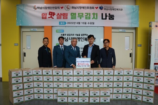 이번 나눔은 지역사회 재가 장애인의 건강한 여름나기를 위해 하남시장애인후원회에서 열무김치 총 750kg 후원했으며 자원봉사 10개 단체아이코리아, 자유총연맹, 하남미래봉사단, 하남시통장단협의회, 한국여성지도자협회, B.B.S)와 함께 재가 장애인 150가정에 가가호호 전달함으로써 뜻깊은 나눔을 실천하는 사업이 진행됐다.