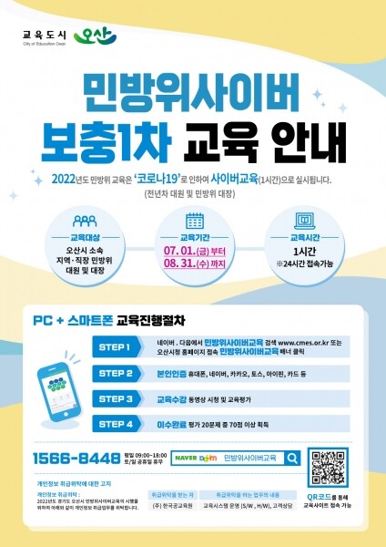 오산시 민방위 업무 관계자는, “민방위대원의 교육 참여 편의성을 높이기 위해 사이버교육 대상을 확대했으며 전쟁 등 민방위 사태를 대비한 역량 교육인 만큼 민방위교육을 꼭 이수해 달라”고 당부했다.