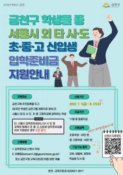 신청 기간은 7월 1일부터 8월 31일까지이며 금천구청 홈페이지 ‘금천소식’에서 신청서를 내려받아 작성 후 이메일 또는 구청 교육지원과에 방문 제출하면 된다.