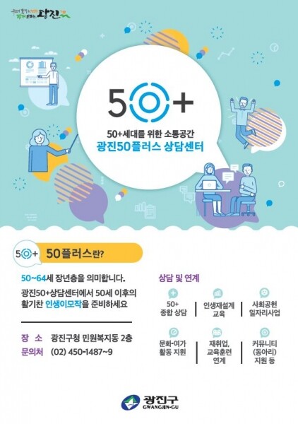 50+상담센터는 50+세대의 새로운 인생 준비와 성공적인 노후생활을 지원하는 곳으로 광진구청 민원복지동 2층에 위치하고 있다.