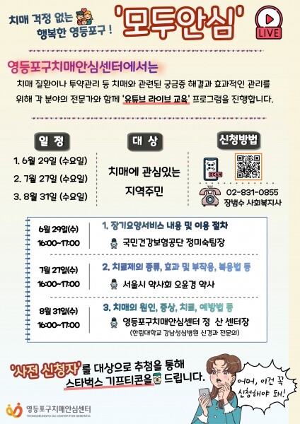 참여 방법은 방송 시간에 맞춰 유튜브 홈페이지 ‘영등포구치매안심센터’ 검색 후 누구든 참여 가능하다.