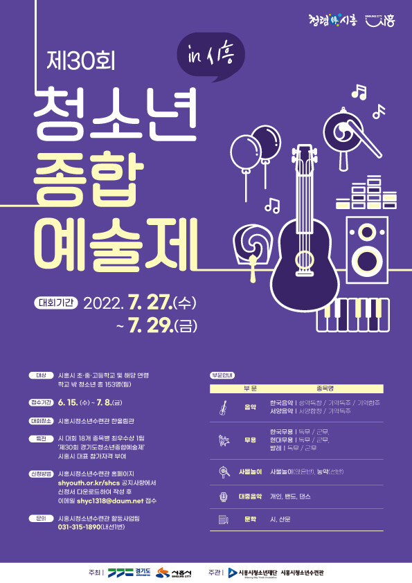 시흥시청소년수련관 관계자는 “시흥시청소년종합예술제를 통해 코로나19로 인해 정체됐던 관내 청소년들의 문화예술 경험을 확대하는 한편 청소년의 문화적 감수성과 예술적 재능을 마음껏 펼칠 수 있도록 돕겠다”고 말했다.