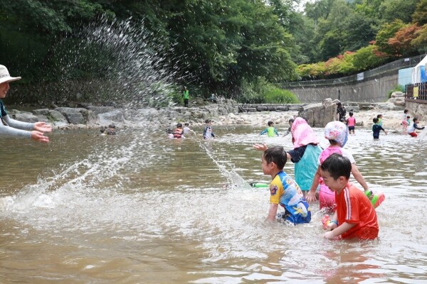 계곡 물놀이장은 길이 130m, 폭 18~30m로 숲속 탁 트인 공간에 수심이 평균 0.4m로 낮아 어린이들이 안전하게 물놀이할 수 있다.