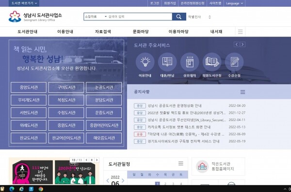 해당 홈페이지는 성남시 15곳 도서관 홈페이지를 한곳에 모아 놓은 포털이다.