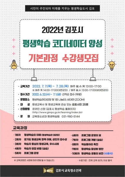 김포시민이면 누구나 무료로 신청 할 수 있으며 강좌 접수는 6월 22일부터 김포시 평생학습 홈페이지를 통한 온라인 선착순 접수로 진행된다.
