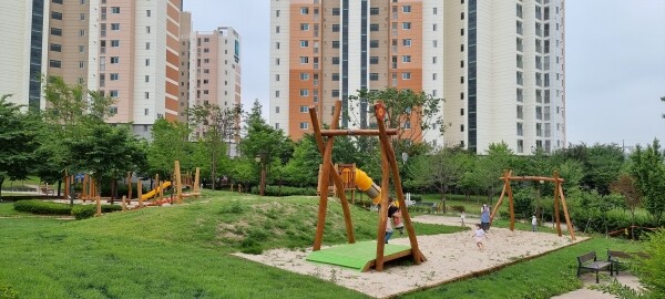 이와 함께 시는 놀이터 내 조경수목과 다양한 초화류를 식재하고 바닥이 올록볼록한 마운딩 언덕을 설치해 이용 아동들의 정서 함양과 안전성 향상에 신경을 썼다.
