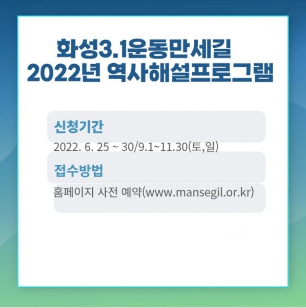 화성시문화재단 독립운동문화팀 관계자는 “가족, 친구, 연인과 함께 화성 곳곳에 분포한 독립운동역사의 흔적을 따라가다 보면 독립지사와 순국선열의 정신을 배우고 여행을 온 듯한 충족감을 느낄 수 있을 것”이라며 “만세길 해설프로그램에 많은 관심과 참여를 바란다”고 전했다.
