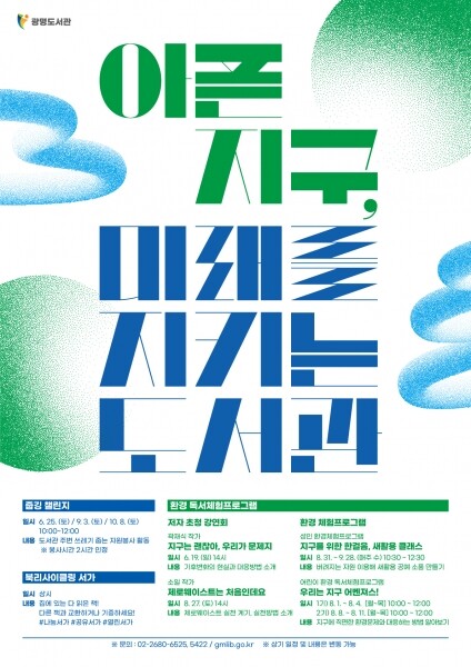 광명도서관 관계자는 “‘아픈 지구, 미래를 지키는 도서관’은 기후위기의 심각성과 환경보호의 필요성을 인식하는 계기를 마련하고 일상 속 지속가능한 친환경 실천 방안을 제시하기 위해 기획됐다”며 “앞으로도 시민들의 많은 참여를 바란다”고 전했다.