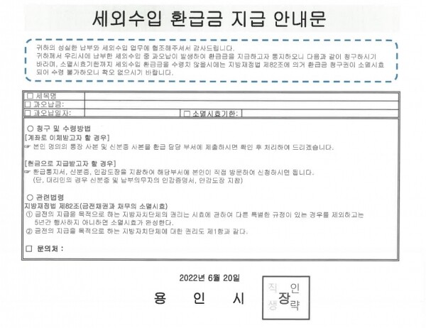 용인시, 다음달 29일까지 세외수입 과오납금 환급 집중 기간 운영