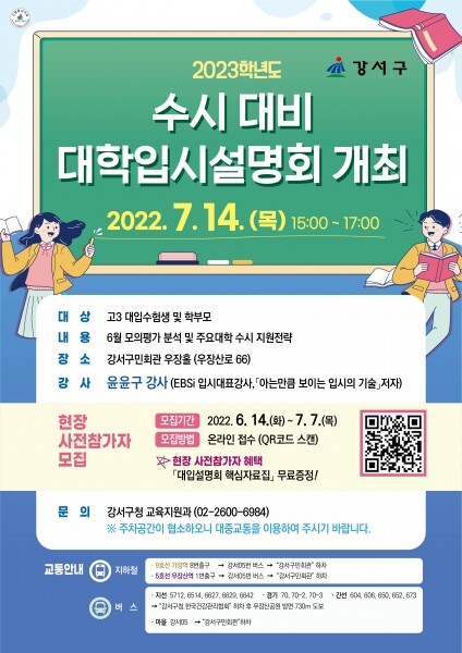 구는 오는 7월 14일 강서구민회관 우장홀에서 ‘2023학년도 수시 대비 대학입시 설명회’를 개최한다고 밝혔다.