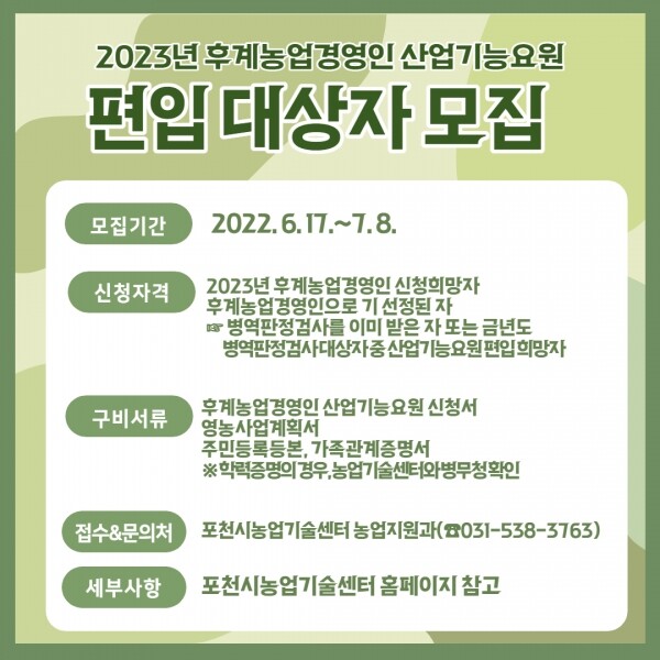 신청 자격은 2023년 후계농업경영인 신청을 희망하는 자, 후계농업경영인으로 기 선정된 자로서 병역판정검사를 이미 받은 자 또는 올해 병역판정검사 대상자 중 2023년도 산업기능요원 편입을 희망하는 자이다.