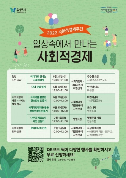 과천시 관내 사회적경제 기업의 서비스를 체험할 수 있는 행사로는 ‘어린이날다 사회적협동조합’의 고사목을 활용한 향초받침 만들기, ‘협동조합 굿스니저’의 사회적경제 제품을 활용한 삼베수세미 만들기, ‘별별문화기획 협동조합’의 나만의 페르소나 가면 만들기 등의 체험행사가 30일과 7월 1일 센터 내 공동체실 등에서 진행된다.