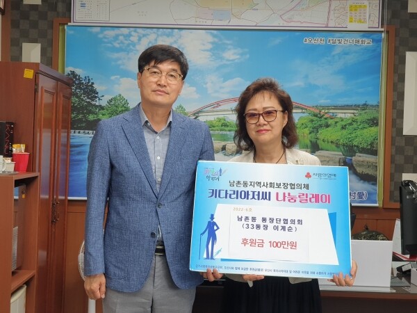 이에 최원배 남촌동장은 “항상 남촌동을 위해 헌신해 주심에 감사드리며 통장님들의 따뜻한 마음이 잘 전해질 수 있도록 남촌동 복지사업으로 뜻깊게 사용하겠다”고 전했다.