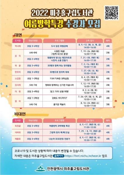 한편 독정골도서관 ‘여름방학 과학체험’, 석바위도서관 ‘그림책 창의 톡톡 교실’, 제물포도서관 ‘나는야 3D프린팅 전문가’ 특강은 비대면 온라인 프로그램으로 진행된다.