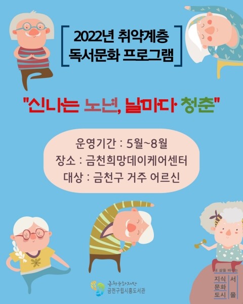 금천구에 거주하는 노인을 대상으로 하는 ‘신나는 노년, 날마다 청춘’은 노인복지센터인 금천희망데이케어센터와 연계해 총 16회의 강의를 실시한다.