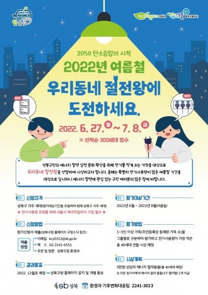 이승로 성북구청장은 “자신만의 에너지 절약 방법이 있거나 에너지 절약에 동참하고자 하는 주민 여러분의 많은 참여로 에너지 절약 문화가 널리 확산되고 탄소중립 도시 성북이 실현되길 바란다”고 전했다.
