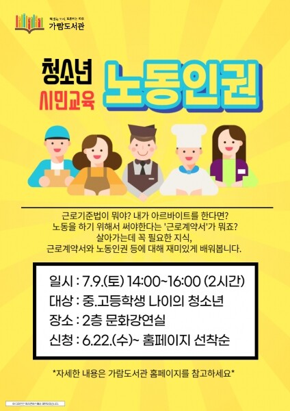 [뉴스써치] 파주시 가람도서관은 오는 7월 9일 가람도서관 문화강연실에서 ‘아는 만큼 도움 되는 청소년 노동인권’을 주제로 청소년 시민교육을 운영한다고 밝혔다.