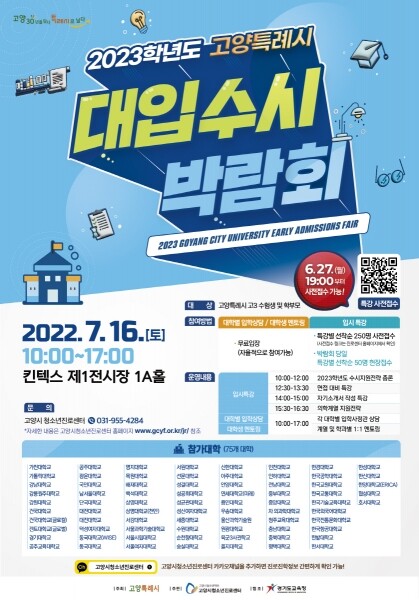 [뉴스써치] 고양시가 2023학년도 대입수시박람회를 7월 16일 킨텍스 제1전시장 1A홀에서 3년 만에 대면으로 진행할 예정이다.