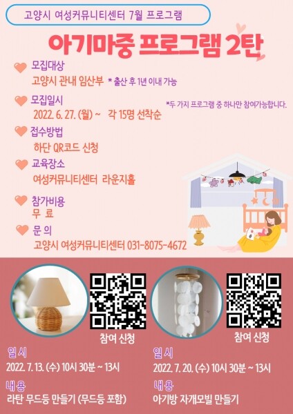 무드등 만들기와 자개모빌 만들기 중 선택해서 참여할 수 있으며 고양시에 거주하는 출산 1년 이내 임산부는 누구나 무료로 참여할 수 있다.