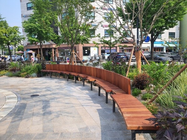 이것은 강동구가 보행로와 도로 사이의 좁은 공간에 꽃과 나무를 심고 휴게시설을 조성한 ‘가로숲길’이다.