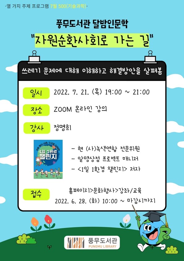 강연 접수는 6월 28일 화요일 오전 10시부터 풍무도서관 홈페이지에서 가능하며 선착순 50명을 모집한다.