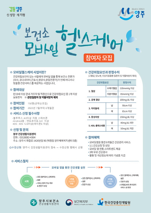 보건소 관계자는 “비대면 건강관리서비스인 모바일 헬스케어 사업을 통해 양주시민의 만성질환을 예방하고 자가 건강관리 능력을 향상 시킬 수 있는 계기가 될 수 있기를 기대한다”며 지속적인 참여와 건강관리를 당부했다.