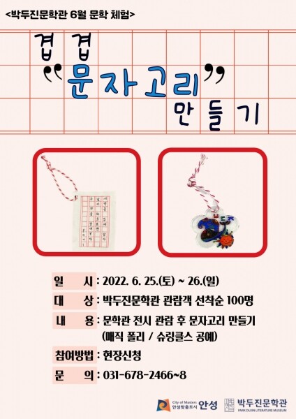 이번 프로그램은 문학관 관람객 가운데 선착순 100명 한정으로 진행되며 체험활동비는 무료이다.