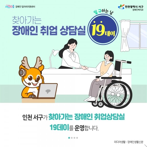 이에 서구는 일자리 취약계층이 많은 가좌·석남 권역을 시작으로 장애인의 접근이 편리한 동 행정복지센터와 장애인복지관, 다중집합 장소 등에서 매월 19일 찾아가는 취업상담실을 운영한다.