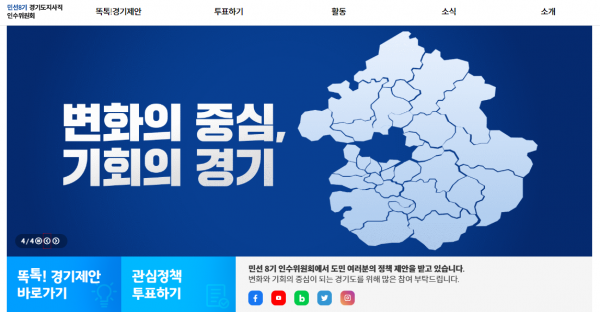 민선 8기 경기도지사직 인수위원회는 오는 27일까지 공식 홈페이지를 통해 ‘김동연 당선인의 공약에 대한 도민의 의견을 여쭙니다’라는 제목으로 당선인 정책 공약에 대한 도민 선호도 조사를 실시할 계획이라고 22일 밝혔다.