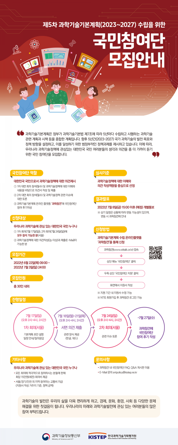 구성된 ‘국민참여단’은 7월 중 2번의 회의를 통해 의견 제안과 토론을 수행하며 발굴된 의견은 한국과학기술기획평가원, 과학기술정책연구원 등 전문가의 심층적인 검토 및 보완을 거쳐 ‘제5차 과학기술기본계획’ 수립에 활용된다.