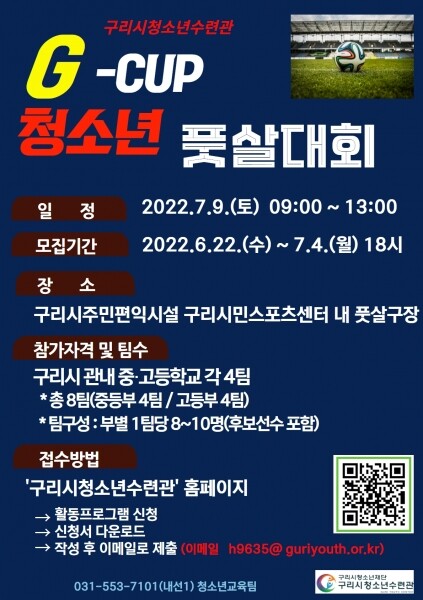 [뉴스써치] 구리시청소년재단 구리청소년수련관은 22일부터 오는 7월 4일까지 구리주민편익시설 구리시민스포츠센터 내 풋살구장에서 개최하는 ‘G-CUP 청소년 풋살대회’의 참가자를 모집한다.