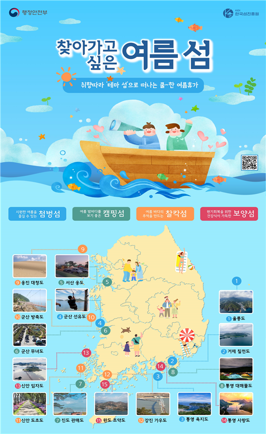 이번 ‘찾아가고 싶은 여름 섬’ 15곳은 물놀이로 시원한 여름을 즐길 수 있는 첨벙섬, 푸른 여름 밤하늘을 보기 좋은 캠핑섬, 뜨거운 여름바다의 추억을 기록할 수 있는 찰칵섬, 원기회복에 필요한 건강식이 가득한 보양섬, 등 4개의 여행 주제에 따라 선정됐다.