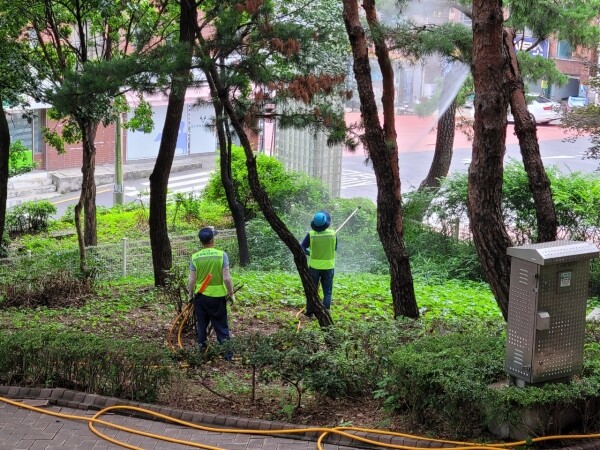 이번 방제는 여름철 병·해충으로 인해 발생할 수 있는 수목의 고사나 미관 저해 등의 피해를 예방하고 생활지역과 밀접해 있는 녹지대에 급증한 모기로부터 주민들이 겪는 불편을 해소하고자 마련됐다.