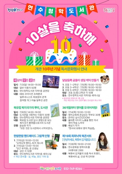 연수청학도서관 개관 10주년을 맞아 진행하는 독서문화행사들과 제19회 희희낙락 북콘서트 등에 대한 자세한 내용은 연수구립공공도서관 홈페이지 공지사항에서 확인할 수 있다.