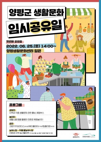 이에 생활문화 주체들의 다양한 문화활동을 주민들과 공유하고 이를 통해 일상 속에 활력을 불어넣고자 ‘양평 생활문화 임시공유일’이라는 이름으로 사업을 추진하게 됐다.