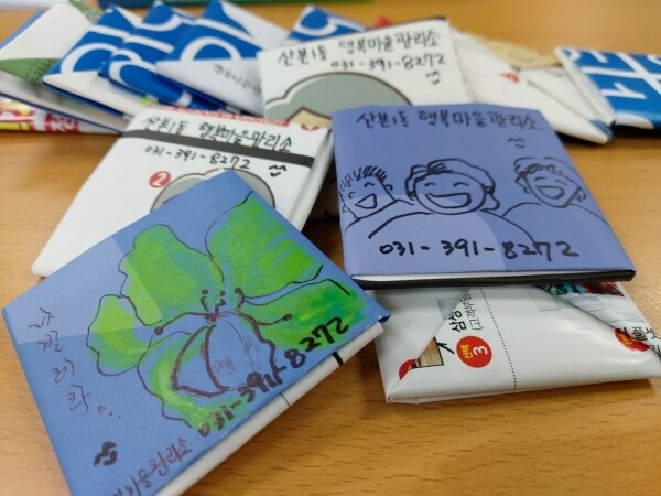 산본1동 행복마을관리소 지킴이들은 어린이공원에서 ‘딱지치기’를 하는 아이들의 모습을 보고선 직접 딱지를 만들기로 계획했고 아이들이 좋아할 만한 그림과 문구를 넣어 선물로 나누어 주고 있다.