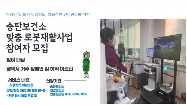 보건소 관계자는 “평택시 장애인 및 허약 어르신이라면 누구나 로봇 재활사업을 통해 조기 보행을 경험하고 건강 증진 효과를 누릴 수 있도록 준비했다”며 “추후 시민의 복합적인 건강요구를 반영해 4차 산업기술을 활용한 재활체계 구축을 위해 최선을 다하겠다”고 했다.