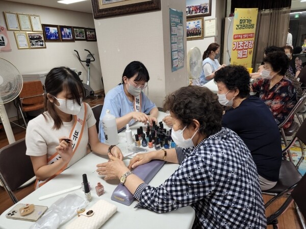 이와 함께 재능대학교 뷰티아트과 학생들의 재능기부를 통해 어르신들에게 네일아트 및 두피마사지 봉사활동도 함께 진행했으며 경로당 내방 어르신들의 건강관리뿐만 아니라 다양한 여가 서비스를 제공해 어르신들의 호응이 높았다.