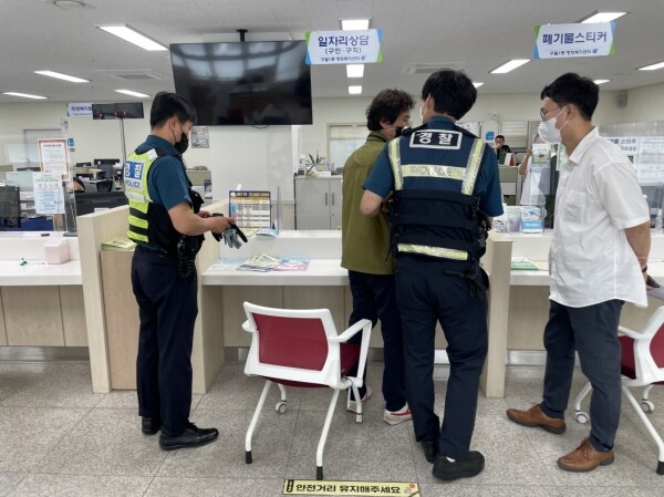 이번 훈련은 상황별 훈련 매뉴얼과 비상대응반 업무분장에 따라 민원인 진정 유도부터 녹음, 비상벨 호출 및 피해공무원 격리, 방문민원인 대피와 가해 민원인 제지, 경찰관 인계 순으로 진행됐다.