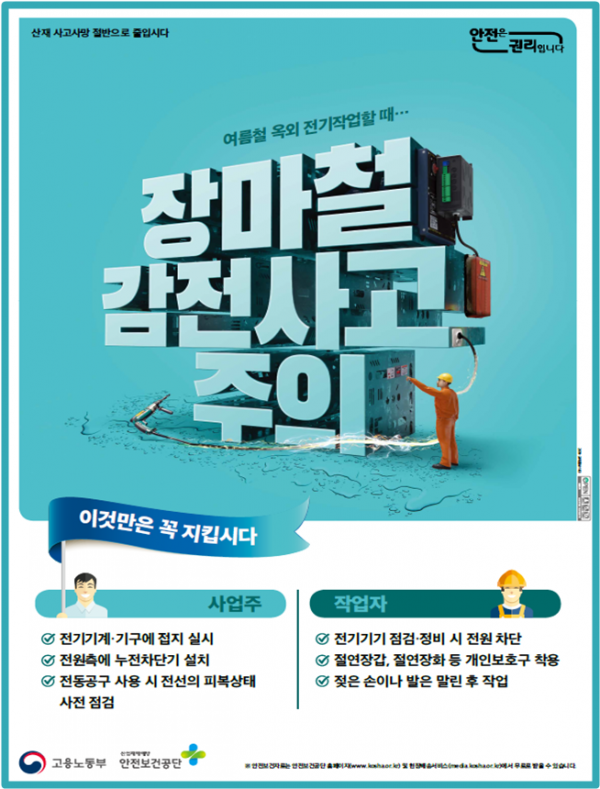 구본근 행정안전부 예방안전정책관은 “여름철에는 잦은 비와 더운 날씨에 흘린 땀 등으로 감전사고의 위험이 높은 만큼, 항상 물기를 말린 후 전기제품을 사용하는 습관을 들여 감전에 주의해야 한다”고 했다.