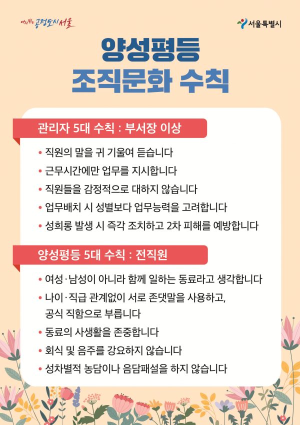 서울시는 조직 내 성별고정관념이 반영된 문화 및 환경 개선에도 힘쓴다.