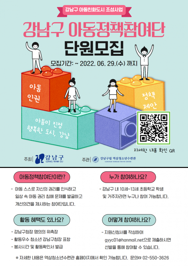 최경희 여성가족과장은 “강남구는 중·고등학생이 중심이 된 ‘제3기 아동청소년참여위원회’와 이번에 모집할 ‘제1기 아동정책참여단’을 통해 41개 아동친화사업을 아동청소년의 눈높이에서 모니터링하고 정책을 제안하고 있다”며 “앞으로도 다양한 계층·연령별 아동의 의견에 귀 기울여 아동권리에 대한 인식을 개선하고 맞춤형 아동친화사업을 추진하겠다”고 말했다.
