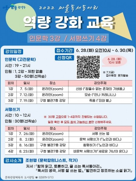 강의는 ‘함께 읽고 토론하고 글 쓰는 독서동아리’, ‘독서의 궁극, 서평 잘 쓰는 법’ 등 저자이자 문학칼럼니스트 작가로 활동 중인 조현행 강사가 진행을 맡아 수강생들과 소통한다.